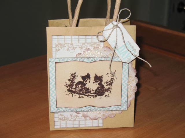I love this fox rubber stamp from Unity Stamp Co. When I first saw it on their website, I knew I had to have it! Ha! I thought I was going to make cards with it (I'm sure I still will), but I decided to use it on a small kraft bag. Here are the steps in creating this shabbby style gift bag: I inked a section of cream colored cardstock with Antique Linen Distress Ink (Tim Holtz). I inked up the foxes from Foxy Christmas (Unity Stamp Co.) in Chocolate Chip ink (Stampin' Up). I used a Spellbinder's die to cut out the label the foxes are on and adhered it to a journaling card (Authentique) I cut from a sheet of patterned paper. I cut out two more journaling cards (Authentique) and lined them up on the left side of the bag to look like one continuous strip of paper. I adhered a doily to the strip. I attached the foxes with foam adhesive. I also inked the entire doily with Antique Linen ink and the edge with Chocolate Chip ink. I made the tag from another journaling card (Authentique) and used a ticket punch on two ends. I attached the gift tag with gold sparkle hemp cord (Lawn Fawn). I hope you enjoyed looking at this creation as much as I enjoyed creating it! Thanks for looking! Peace and love, Dawn